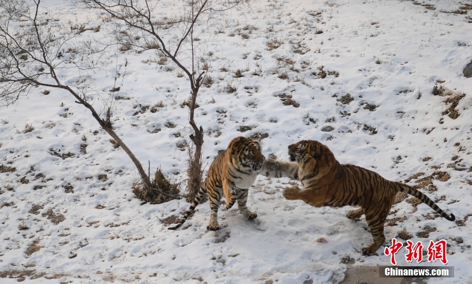 12月27日,山東濟(jì)南野生動物世界里的老虎在雪地上嬉戲玩耍。中新社記者 張勇 攝