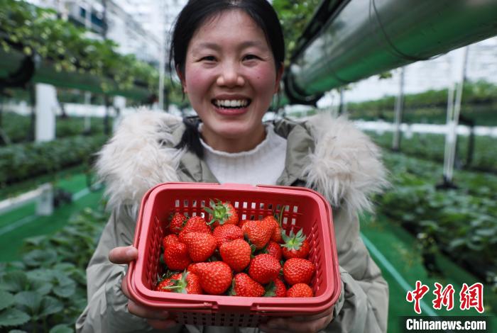 12月28日,安徽省合肥市市民在肥西縣柿樹崗鄉(xiāng)周樓村數字農旅果蔬大棚里采摘草莓。陳家樂攝