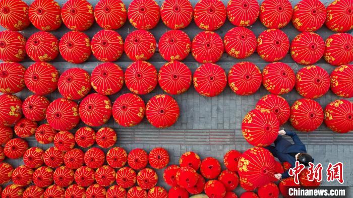 農(nóng)歷龍年春節(jié)臨近,象征著喜慶的大紅燈籠迎來產(chǎn)銷旺季。近日,在浙江省金華市武義縣桃溪鎮(zhèn)陶村,王雪平和潘偉娥夫婦忙著生產(chǎn)銷售各種類型的燈籠產(chǎn)品。王雪平家生產(chǎn)的大紅燈籠(無人機拍攝)。沈云建 攝