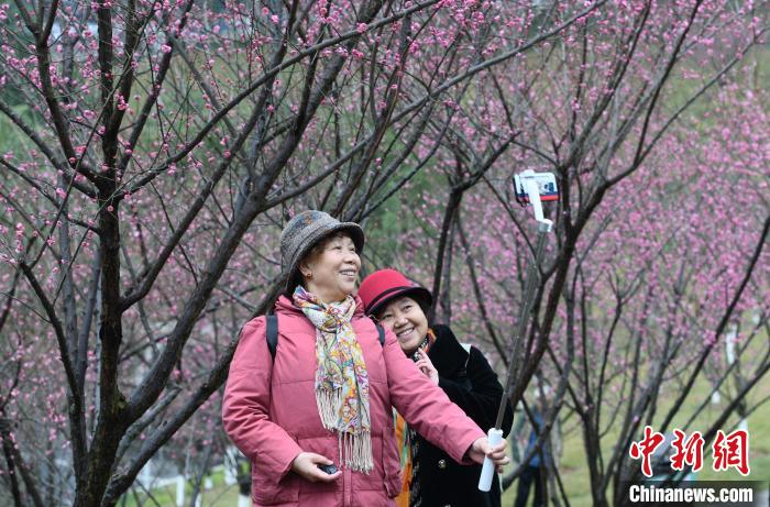 1月19日,重慶沙坪壩歌樂山紅巖景區(qū)內(nèi)大面積的紅梅競相綻放,漫山紅梅散發(fā)出沁人心脾的花香,吸引不少市民前來游玩賞花、尋香打卡。圖為市民在紅梅林下自拍留念。 中新網(wǎng)記者 周毅 攝