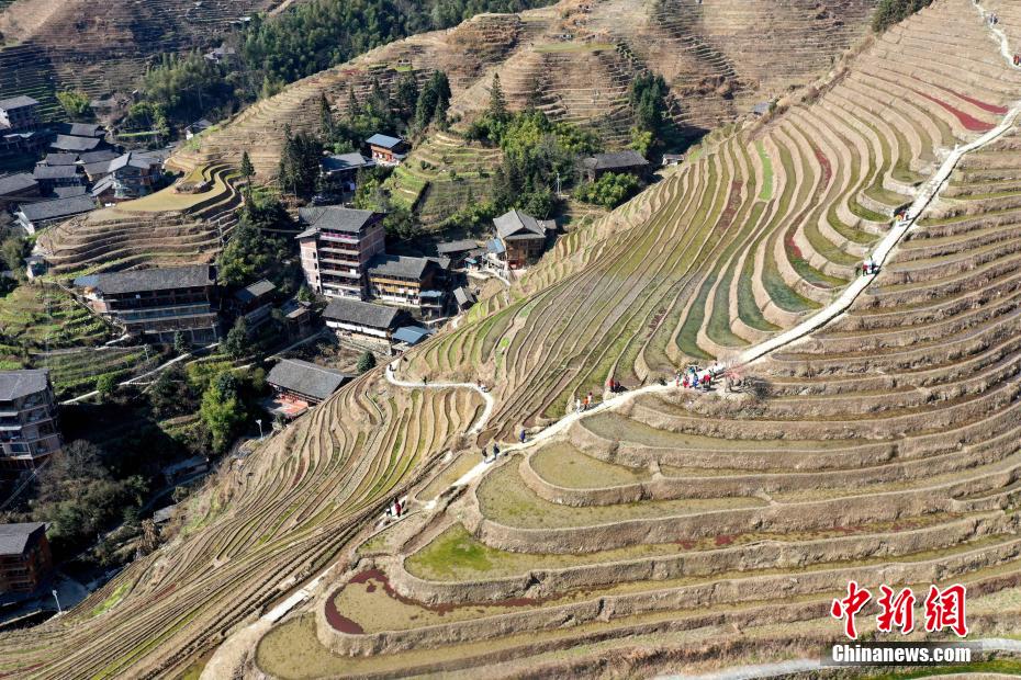 2月11日,游客在廣西桂林市龍勝各族自治縣龍脊梯田景區(qū)觀光游覽。(無(wú)人機(jī)照片)潘志祥 攝