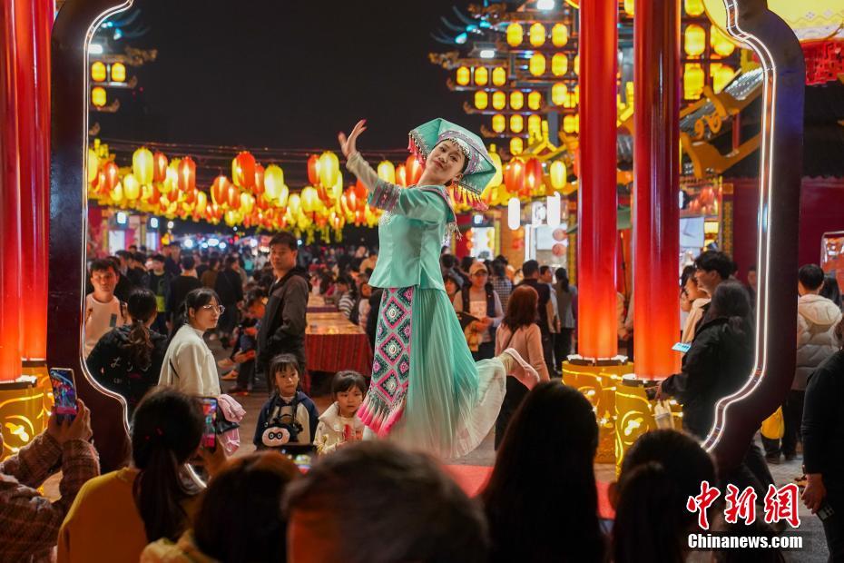 2月17日,廣西南寧,南寧之夜景區(qū)上演的壯族歌舞。春節(jié)期間,南寧之夜景區(qū)上演豐富多彩的非遺表演,為市民和游客增添喜慶熱鬧的年味氛圍。中新社記者 陳冠言 攝