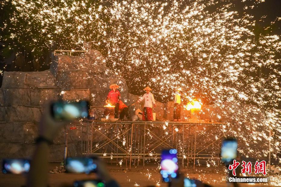 2月17日,廣西南寧,民眾在南寧之夜景區(qū)舉起手機拍攝打鐵花表演。春節(jié)期間,南寧之夜景區(qū)上演豐富多彩的非遺表演,為市民和游客增添喜慶熱鬧的年味氛圍。中新社記者 陳冠言 攝