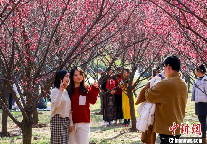 市民在盛開的梅花樹下拍照游玩。張暢 攝