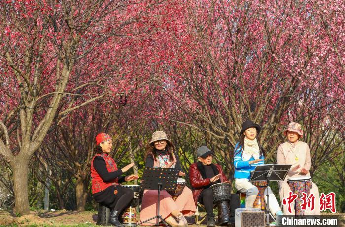 音樂愛好者在盛開的梅花樹下演奏非洲手鼓。張暢 攝