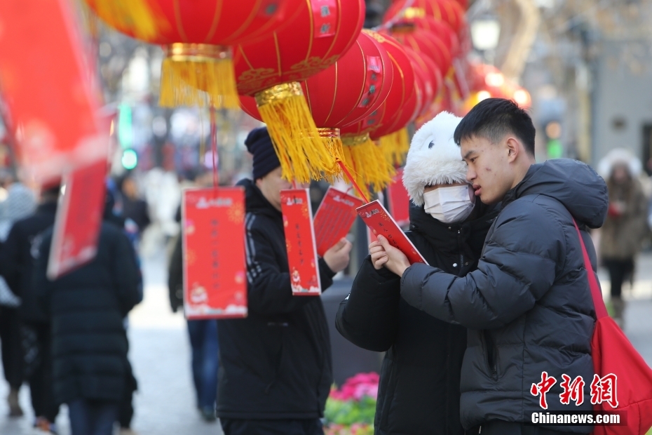 2月21日,黑龍江哈爾濱,掛有謎語的花燈扮靚中央大街,吸引民眾競猜。中新社發(fā) 于琨 攝
