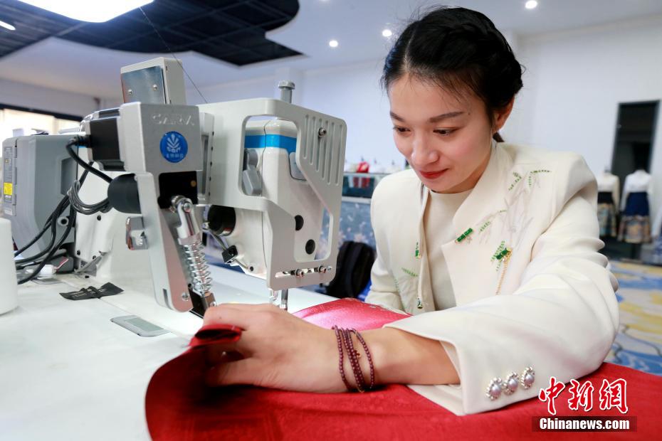 曹縣洛如嫣原創(chuàng)漢服公司負責(zé)人姚馳行正在為顧客趕制高端訂制馬面裙。