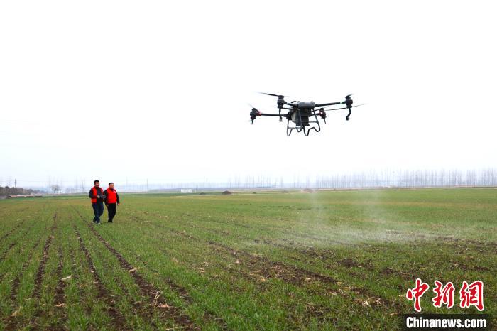 無人駕駛植保機(jī)在小麥田里進(jìn)行噴灑作業(yè)。孫慧 攝