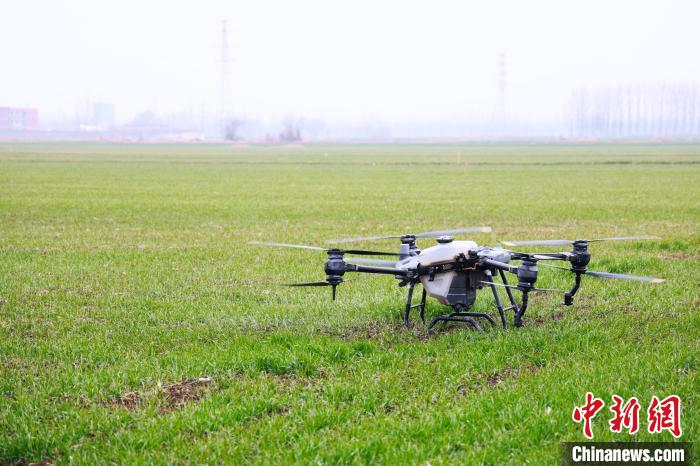無人駕駛植保機(jī)在小麥田里進(jìn)行噴灑作業(yè)。孫慧 攝