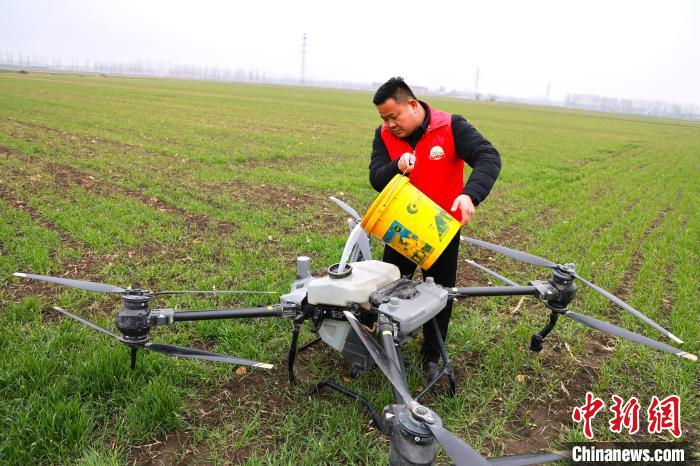 無人駕駛植保機(jī)在小麥田里進(jìn)行噴灑作業(yè)。孫慧 攝