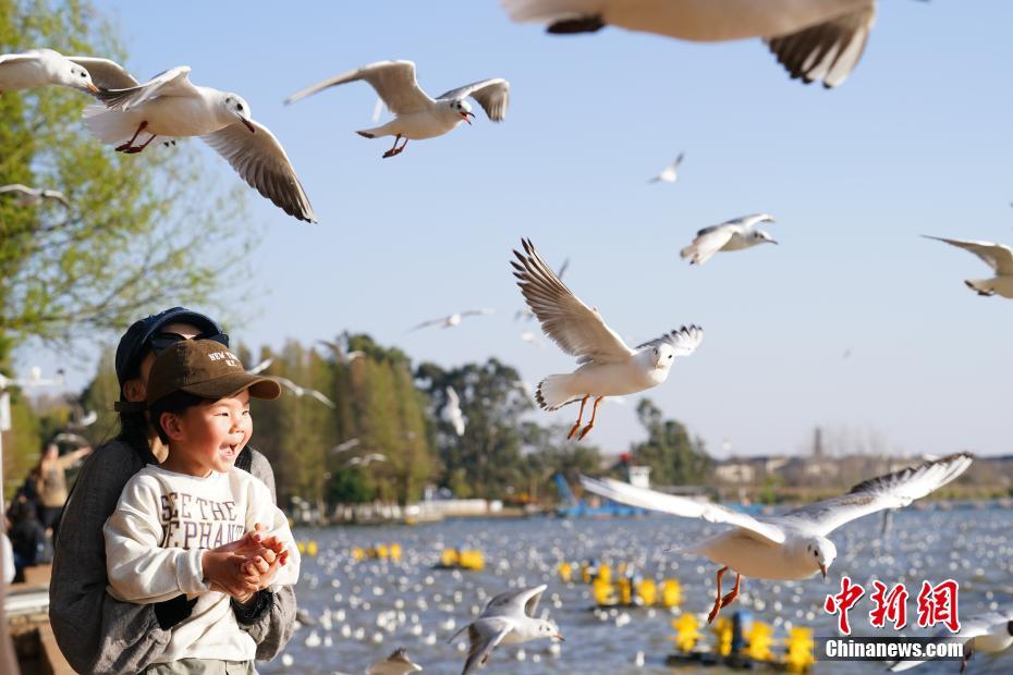 3月4日,云南昆明,小男孩和媽媽在滇池邊喂紅嘴鷗。隨著天氣回暖,越冬的紅嘴鷗將陸續(xù)飛回棲息地,眾多市民和游客來到滇池邊與紅嘴鷗互動(dòng)。 中新社記者 劉冉陽 攝