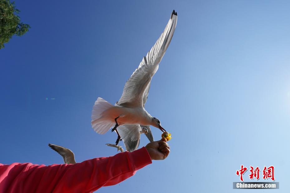 3月4日,云南昆明,紅嘴鷗從游客手中取食。隨著天氣回暖,越冬的紅嘴鷗將陸續(xù)飛回棲息地,眾多市民和游客來(lái)到滇池邊與紅嘴鷗互動(dòng)