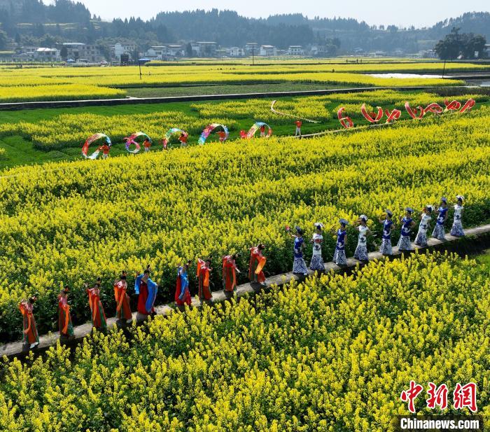 文化志愿者正在油菜花海中舞彩帶龍。劉永紅 攝