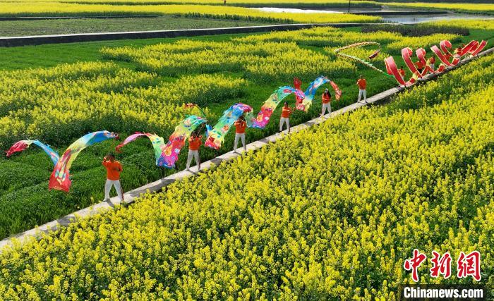 文化志愿者正在油菜花海中舞彩帶龍。劉永紅 攝