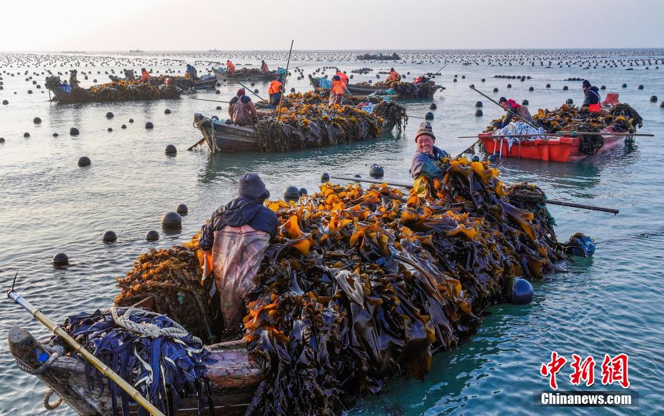 連日來,山東榮成各大海洋牧場海帶養(yǎng)殖區(qū)呈現(xiàn)一派繁忙的采收景象。滿載海帶的漁船成為海上一道獨特的風(fēng)景。