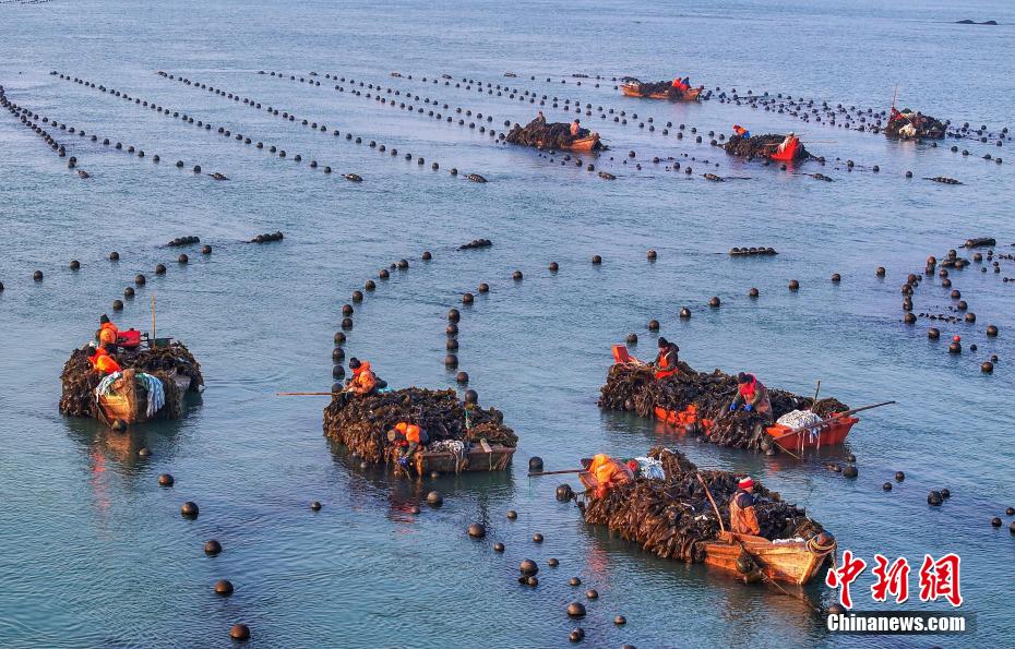 圖為養(yǎng)殖工人們在采收海帶。李信君 攝