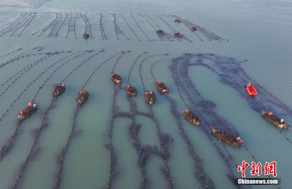 圖為養(yǎng)殖工人們在采收海帶。李信君 攝