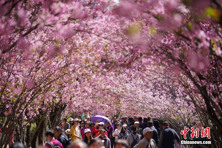 3月11日,云南省昆明市圓通山的櫻花和垂絲海棠競相綻放,吸引民眾前來觀賞“圓通花潮”盛景。圖為民眾前來賞花。中新社記者 劉冉陽 攝