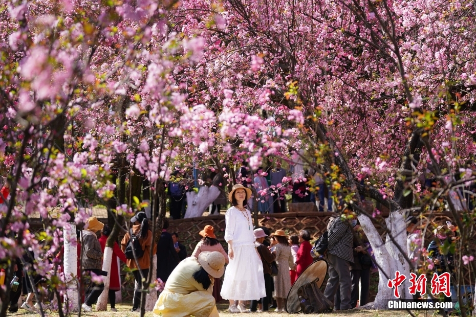 3月11日,云南省昆明市圓通山的櫻花和垂絲海棠競相綻放,吸引民眾前來觀賞“圓通花潮”盛景。圖為民眾前來賞花。中新社記者 劉冉陽 攝