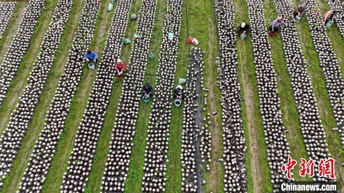 航拍村民在田間地頭采收黑木耳。龔普康 攝