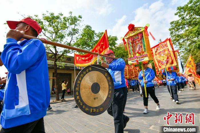 圖為在“裝軍巡游”隊(duì)伍中鳴鑼開道。中新網(wǎng)記者 駱云飛 攝