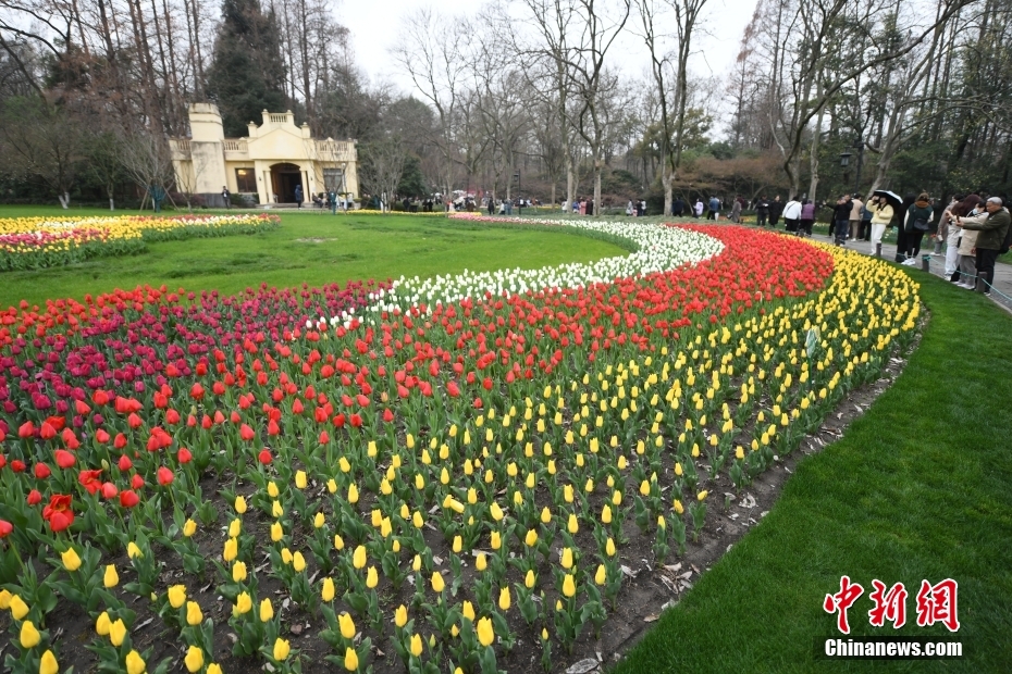3月18日,大片的郁金香吸引游人。江南春日,浙江杭州西湖太子灣約40萬株郁金香次第開放,爛漫景象令人流連。中新社記者 王剛 攝