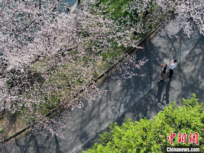 在浙江金華東陽(yáng)市,市民櫻花樹下享受春光(無(wú)人機(jī)照片)。胡揚(yáng)輝 攝