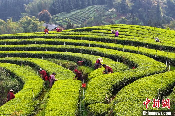 當?shù)夭柁r(nóng)正忙著采摘春茶。廖勝春 攝