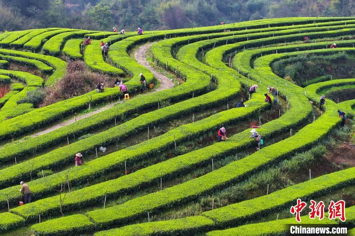 當(dāng)?shù)夭柁r(nóng)正忙著采摘春茶。廖勝春 攝