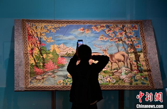 4月21日,由遼寧省博物館主辦的“絲藝傳承”展覽在館內(nèi)三樓20號展廳開展,展品選自館藏新中國成立初期以刺繡、緙絲、織錦工藝制作的織繡藝術品,較為全面而系統(tǒng)地展示了新中國成立初期和當今織繡技藝的發(fā)展路程。圖為觀眾在用手機拍攝毛線《秀三鹿》。中新網(wǎng)記者 于海洋 攝