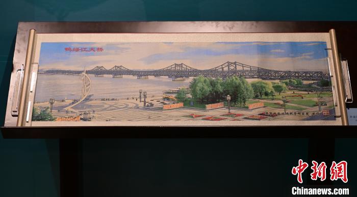 圖為展出的柞蠶絲織《鴨綠江大橋》作品。中新網(wǎng)記者 于海洋 攝