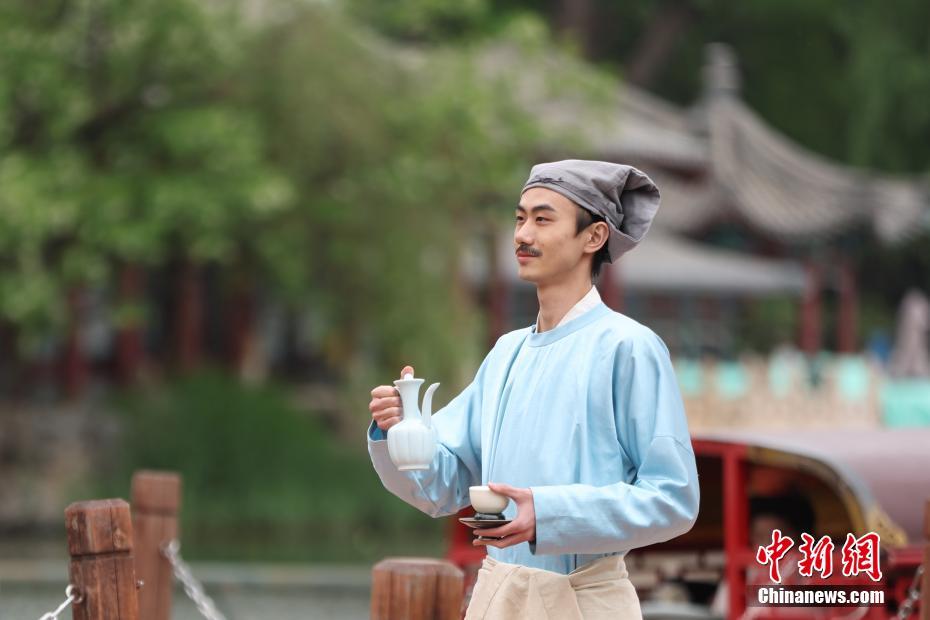 4月28日,“北京地區(qū)考古出土服飾形象復(fù)原動態(tài)展示”亮相北京什剎海荷花市場游船碼頭。北京聯(lián)合大學(xué)考古研究院從北京地區(qū)重大考古發(fā)現(xiàn)中,篩選出16件文物作為展示主題,復(fù)原制作其中包含的服飾形象、家具、器物等內(nèi)容,形成“北京地區(qū)考古出土服飾形象復(fù)原動態(tài)展示”。中新社記者 蔣啟明 攝
