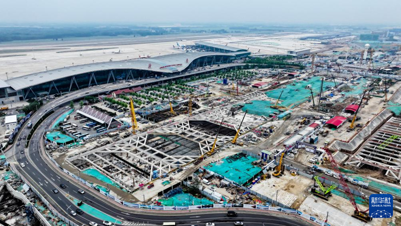 濟南遙墻機場綜合交通樞紐工程中鐵十局工地施工現(xiàn)場(5月5日攝,無人機照片)。新華社記者 郭緒雷 攝