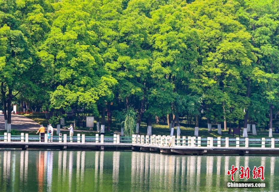 5月8日,湖北武漢,初夏的武漢東湖各種樹木郁郁蔥蔥,碧水環(huán)繞綠意盎然,令人心曠神怡。圖為游人在東湖散步游玩。中新社記者 張暢 攝