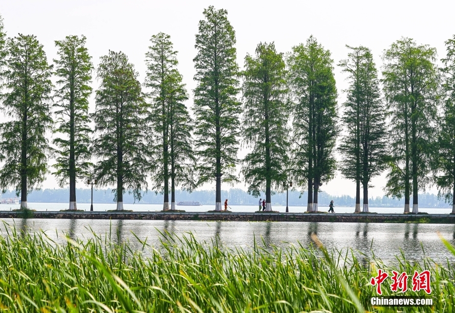 5月8日,湖北武漢,初夏的武漢東湖各種樹(shù)木郁郁蔥蔥,碧水環(huán)繞綠意盎然,令人心曠神怡。圖為游人在東湖散步游玩。中新社記者 張暢 攝