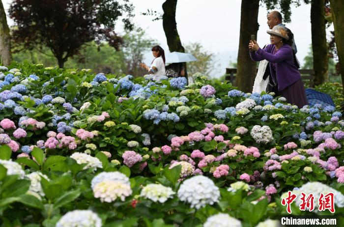 5月12日,重慶市巴南區(qū)二圣鎮(zhèn)天坪山云林天鄉(xiāng)景區(qū)內(nèi),分布在漫山遍野的百余畝繡球花色彩斑斕似油畫(huà),吸引不少游客前往觀賞、拍照留念。圖為一名小朋友在繡球花海中玩耍。中新網(wǎng)記者 周毅 攝