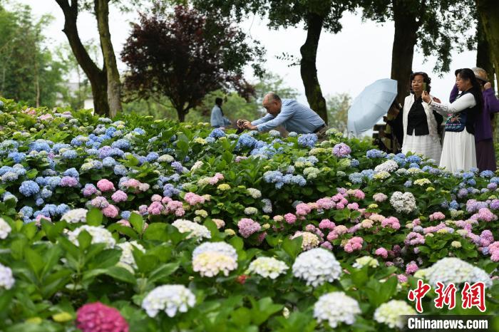 圖為各色繡球花盛開吸引游客觀賞、拍照。中新網(wǎng)記者 周毅 攝