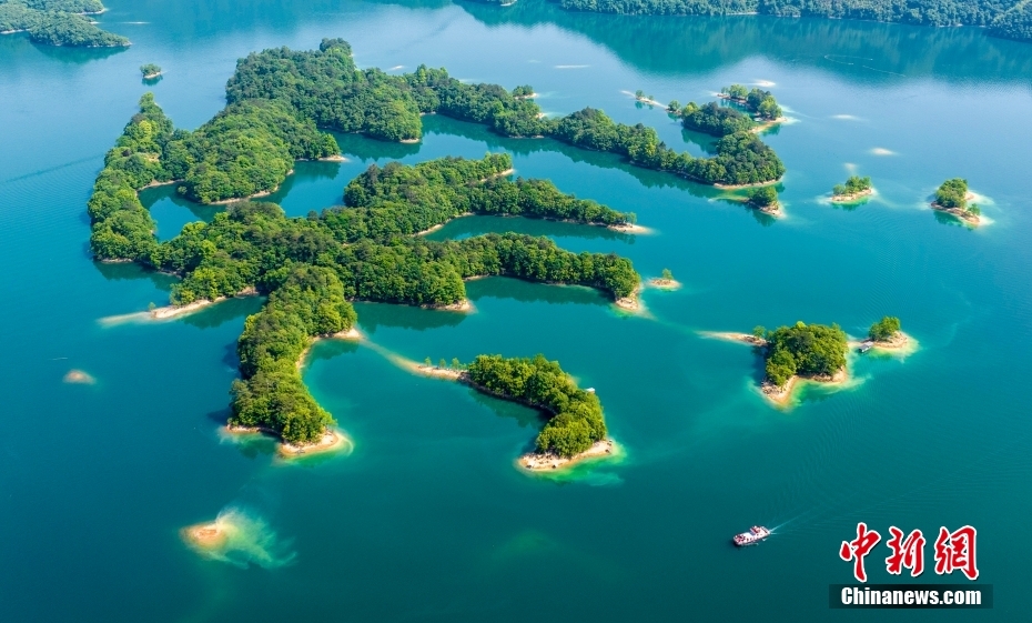 5月18日,安徽省黃山市太平湖風(fēng)景區(qū)青山起伏連綿,滿目青翠,湖水清澈碧透,湖天一色,景美如畫。CNSphoto 左學(xué)長 攝