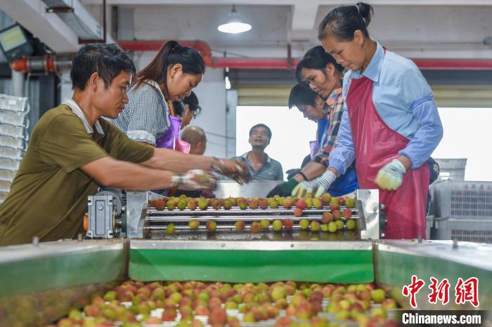 圖為海南紅明農(nóng)產(chǎn)品(荔枝)交易中心的工作人員篩選荔枝。中新網(wǎng)記者 駱云飛 攝