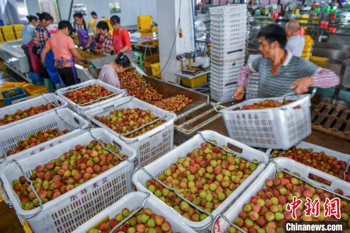 圖為海南紅明農(nóng)產(chǎn)品(荔枝)交易中心的工作人員搬運(yùn)荔枝。中新網(wǎng)記者 駱云飛 攝