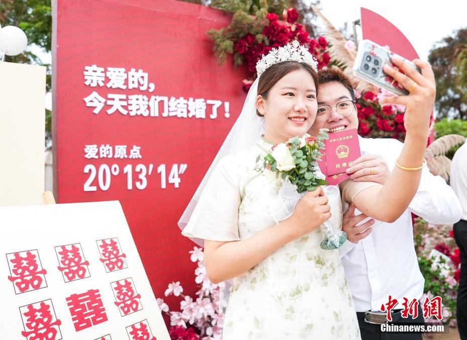 5月19日,世界愛(ài)情角520鄉(xiāng)村振興音樂(lè)季活動(dòng)在廣東湛江徐聞縣角尾鄉(xiāng)舉行,百對(duì)新人在現(xiàn)場(chǎng)舉行集體婚禮儀式。本次活動(dòng)由共青團(tuán)中央青發(fā)部、共青團(tuán)廣東省委員會(huì)指導(dǎo)舉辦,以“世界愛(ài)情角 相愛(ài)最南端”為主題,聚焦助力“百千萬(wàn)工程”和綠美廣東生態(tài)建設(shè)領(lǐng)域成效,打造“南極村”特色文旅產(chǎn)業(yè),塑造“世界愛(ài)情角”文旅名片,進(jìn)一步豐富“鮮美湛江”文旅品牌體系。中新社發(fā) 許舒智 攝