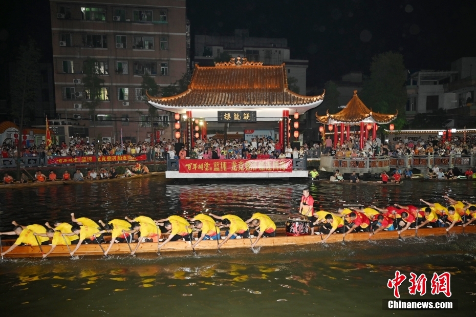5月25日晚,廣東省佛山市疊滘村龍船在狹窄河道上進(jìn)行夜間訓(xùn)練。臨近端午節(jié),疊滘的龍船每晚在村內(nèi)河涌訓(xùn)練,準(zhǔn)備端午節(jié)的疊滘龍舟漂移賽。中新社記者 陳楚紅 攝