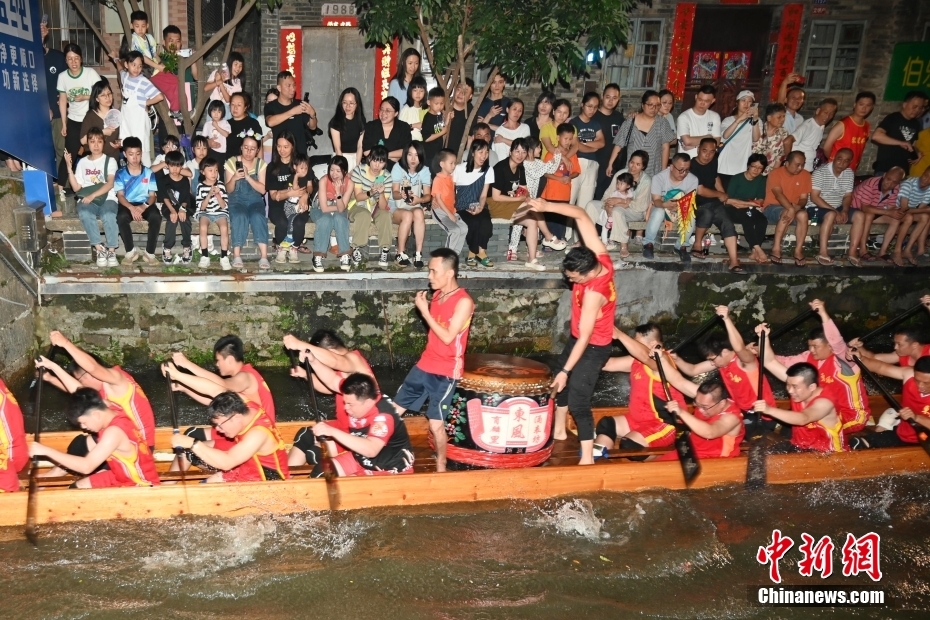 5月25日晚,廣東省佛山市疊滘村龍船進行夜間訓(xùn)練,在狹窄河道上飛快通過急彎,上演水上漂移。臨近端午節(jié),疊滘的龍船每晚在村內(nèi)河涌訓(xùn)練,準備端午節(jié)的疊滘龍舟漂移賽。中新社記者 陳楚紅 攝