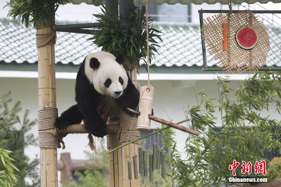 5月26日,山東濟南,大熊貓“雅吉”享用“生日禮物”。當(dāng)日,山東濟南動物園大熊貓“雅吉”迎來10周歲生日,動物園工作人員精心準(zhǔn)備“生日蛋糕”,為它慶生。郭玲 攝