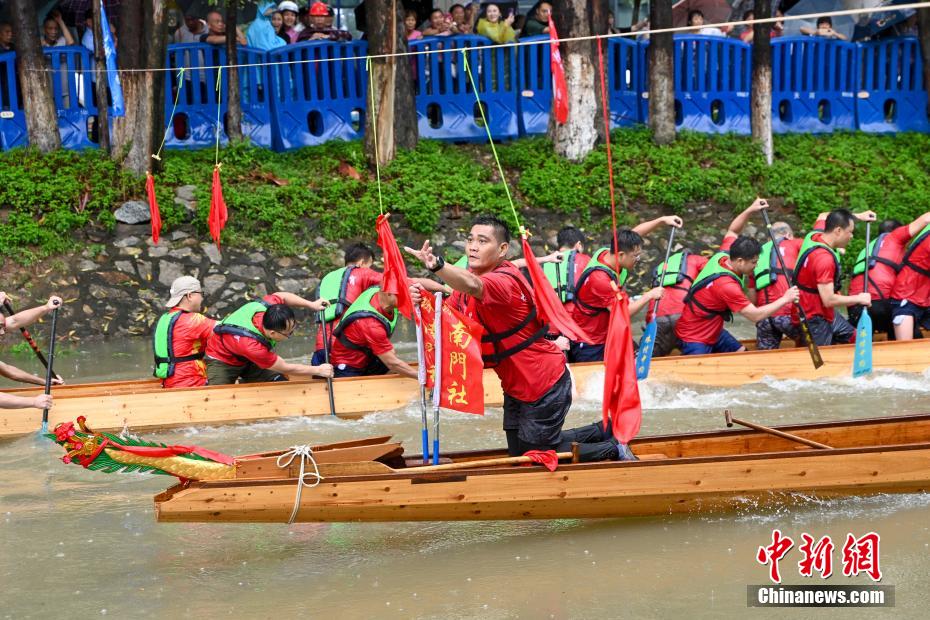 6月3日,端午節(jié)將至,一場傳統龍舟直道折返競速賽在廣州深涌河道內舉行,來自深涌兩岸村落的10條傳統龍舟在雨中展開角逐,吸引不少市民前來觀看。圖為龍舟擺舵手在比賽中取旗。陳驥旻 攝