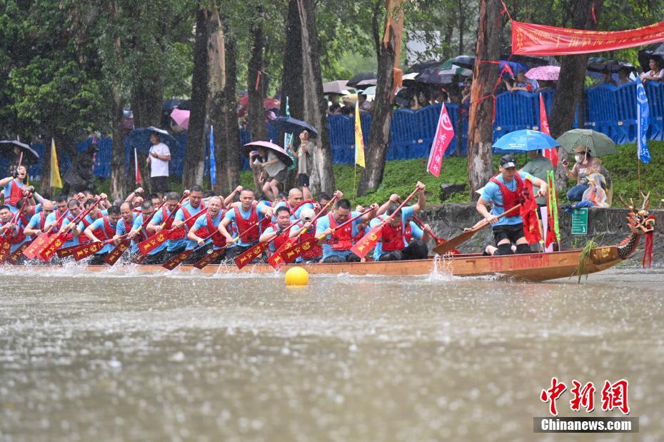 6月3日,端午節(jié)將至,一場傳統(tǒng)龍舟直道折返競速賽在廣州深涌河道內(nèi)舉行,來自深涌兩岸村落的10條傳統(tǒng)龍舟在雨中展開角逐,吸引不少市民前來觀看。圖為傳統(tǒng)龍舟在雨中競速。陳驥旻 攝