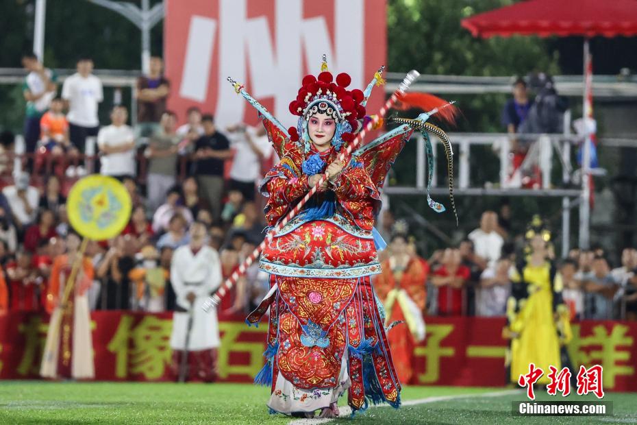 6月10日,河南省洛陽市、西藏自治區(qū)日喀則市、內(nèi)蒙古自治區(qū)呼倫貝爾市的足球隊齊聚貴州省黔東南苗族侗族自治州榕江縣“村超”足球場。除了開展足球友誼賽外,三個城市的拉拉隊和助演嘉賓還分別在球賽中場休息和展演環(huán)節(jié),為上萬觀眾帶來了極具特色的節(jié)目表演。圖為洛陽市的節(jié)目《潮服》。瞿宏倫 攝