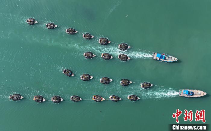 6月11日,在山東省榮成市愛倫灣海帶養(yǎng)殖區(qū),養(yǎng)殖工人駕駛滿載海帶的漁船、舢板返港卸船。榮成是中國最大的海帶產(chǎn)地,每年6月是海帶收獲最繁忙的時節(jié)。(無人機(jī)照片)李信君 攝