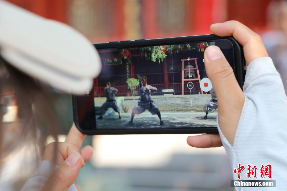 天下武功出少林,少林功夫甲天下。6月17日,在素有“天下第一名剎”之稱的河南鄭州嵩山少林寺,少林武僧和“洋弟子”們輪番登場(chǎng),向國(guó)內(nèi)外游客展示少林功夫。他們一招一式行云流水,拳腳交錯(cuò)間剛?cè)岵?jì),充滿力量與美感,展示了中國(guó)功夫的獨(dú)特魅力。圖為游客拍攝少林功夫表演。李海珠 攝