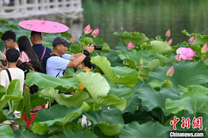 6月17日,荷花吸引游客拍照。近日,云南省昆明市大觀公園內(nèi)荷花初放,吸引不少游客前來賞花、拍照。中新社記者 李嘉嫻 攝
